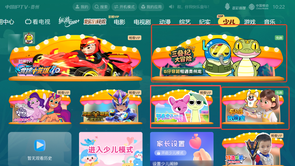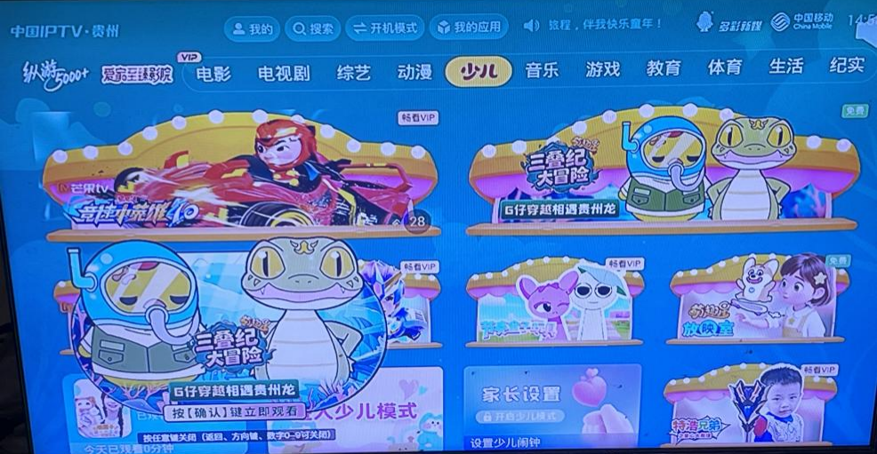 (1)电视端:贵州IPTV移动端少儿栏目首页,联通电信端教育栏目首页